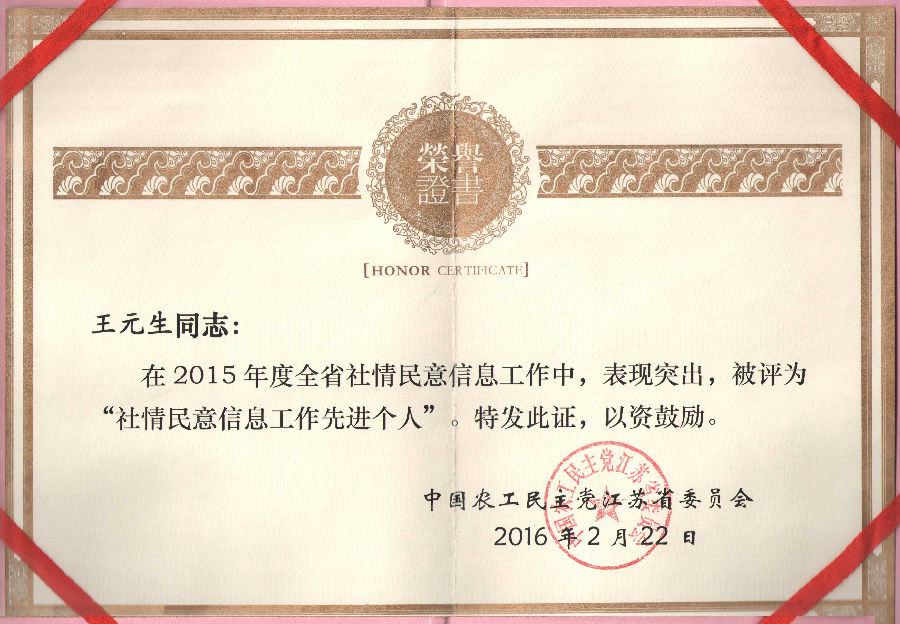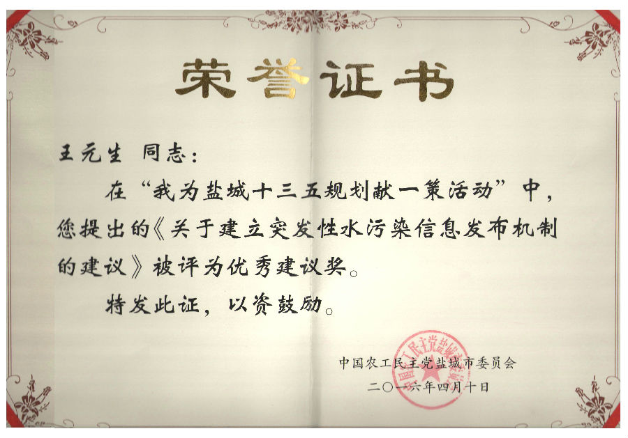 近期,我校王元生老师先后获得中国农工民主党江苏省委员会“社情民意信息工作先进个人”、中国农工民主党盐城市委员会“我为盐城‘十三五’规划献一策活动”优秀建议奖。