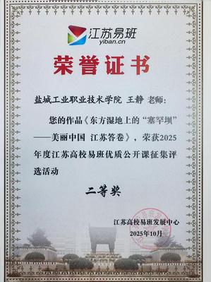 近日,江苏高校易班发展中心公布2025年度江苏高校易班优质公开课征集评选活动结果。学校建筑工程学院王静老师作品《东方湿地上的“塞罕坝”——美丽中国 江苏答卷》荣获二等奖。